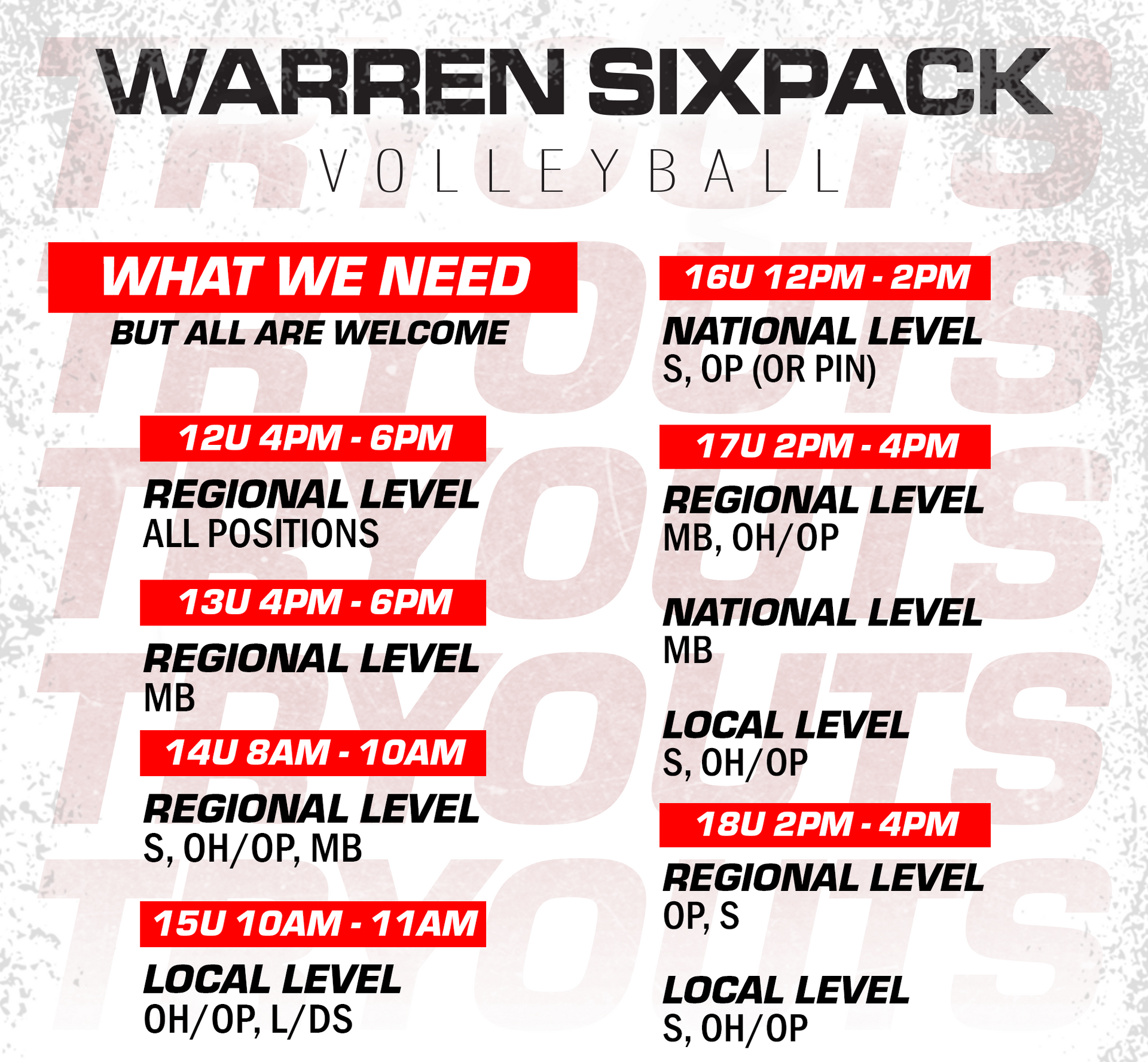 PLEASE MAKES SURE YOU SIGN UP FOR YOUR DESIRED SESSION IN ADVANCE PRIOR TO THE TRYOUT DATE.